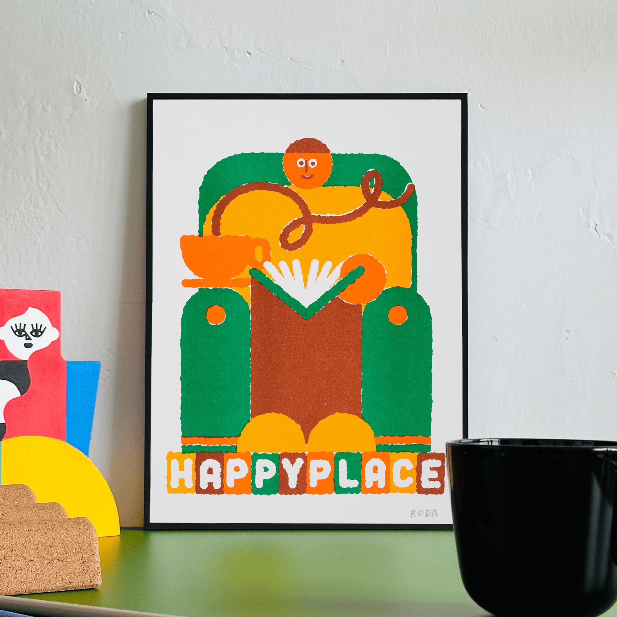 Risography is a printing system amidst screen printing and photocopying. It's printed by layers, through the creation of a master stencil for each color. The paper will pass through the machine as many times as inks in the image. This printing method presents a number of characteristic imperfections, such as register faults, and ink marks from the printing roller, which confer a uniqueness to each print. These can usually be corrected with an eraser.